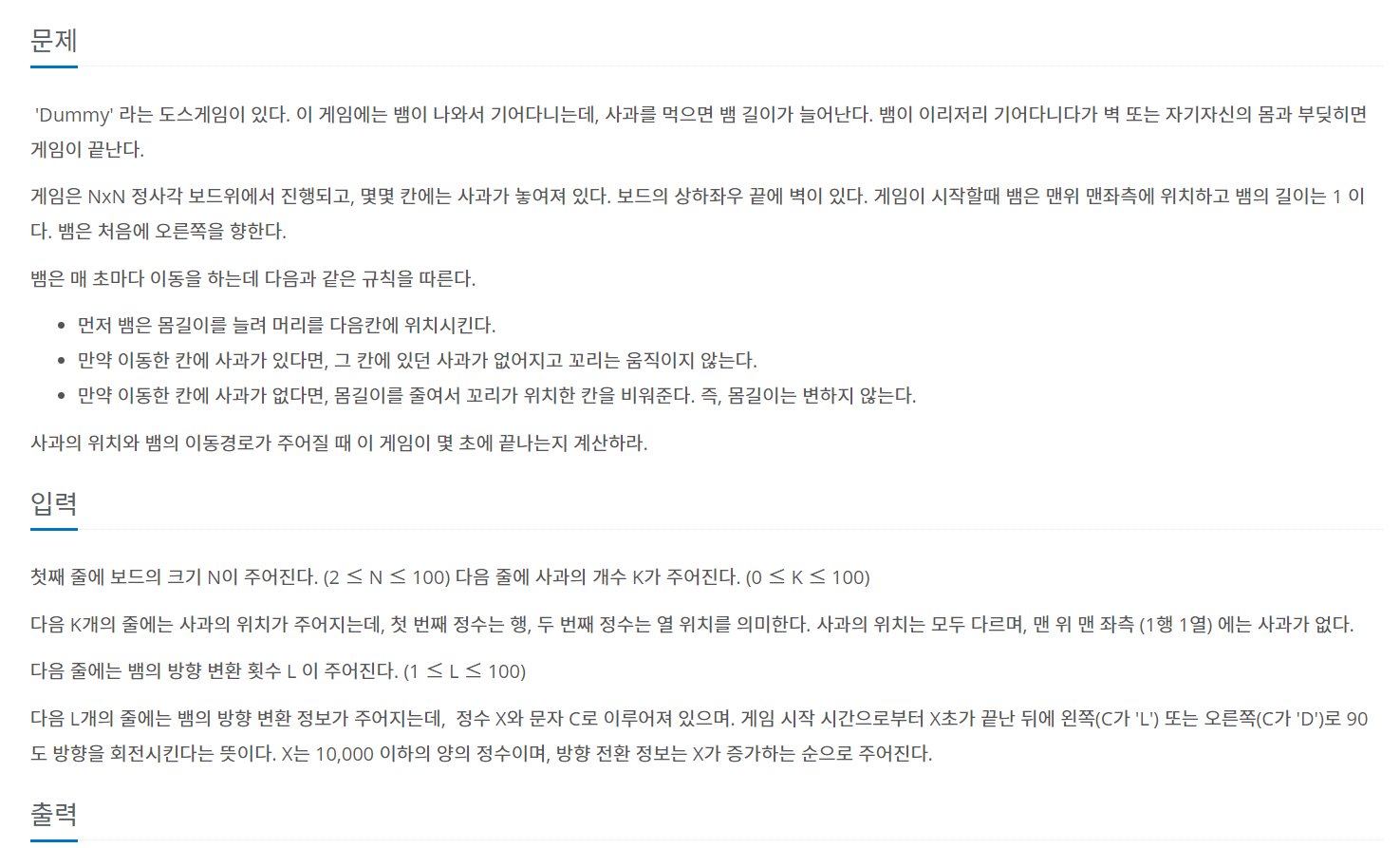 가장 먼저 주의해야 할 점은 보드의 맨 위 좌측의 좌표가 0행 0열이 아닌 1행 1열이라는 점입니다. 따라서 사과의 위치를 입력을 받은 후 일반적으로 사용하는 행, 열의 위치에 사과를 저장하기 위해 입력된 좌표에서 각각 1씩 빼서 보드에 사과를 집어넣어야 합니다. 단순하게 문제의 조건을 따라만 가면 그다지 어려운 문제는 아닙니다. 뱀이 바라보는 방향을 기준으로 한 칸씩 이동을 하게 되는데 몸길이가 늘려 머리가 다음칸에 가게 됩니다. 다음칸이 벽이거나 꼬리가 있는 부분이 아닌 한 머리가 속한 칸이 사과가 없는 칸이면 꼬리가 한 칸 앞으로 이동을 해야 합니다. 따라서 뱀이 현재 위치한 좌표들로 리스트를 만든 후 뱀이 머리가 닿는 부분을 리스트에 append 하게 되면 반대로 꼬리의 부분은 리스트의 맨 앞부분일 것입니다. 따라서 해당 리스트의 맨 앞을 pop 해주게 되면 쉽게 꼬리를 한 칸 앞으로 이동해줄 수 있습니다. 비록 리스트의 pop이 O(N)의 시간 복잡도를 가지더라도 이 문제에서는 통과할 수 있습니다.