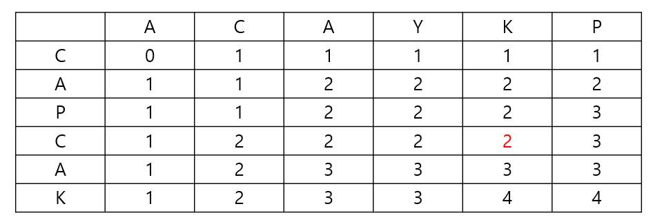 아래의 표에서 빨간색으로 칠한 3행 4열을 보시면 ACAYK에 CAPC의 LCS가 2라는 것을 알 수 있습니다.