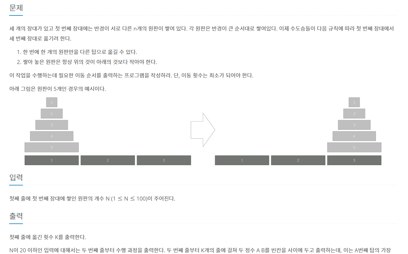 문제를 살펴보면 N이 20 이하인 경우 출력 예시처럼 출력을 하고 그 외의 경우 즉 20을 초과하는 경우는 단순히 몇 번을 옮겨야 하는지만 출력하라고 하였습니다. 이는 숫자가 너무 커져 메모리 초과를 막기 위한 조건입니다. 따라서 이는 재귀를 통해 횟수를 구하는 것이 아닌 일종의 점화식을 구하라는 것을 문제에서 암묵적으로 힌트를 주는 것임을 알 수 있습니다. 그렇다면 규칙을 파악해봅시다.