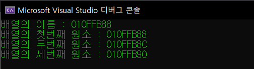 위의 코드와 실행결과를 통해 배열 arr가 int형 이므로 각각 4바이트씩 주소 값의 차이가 나는 것을 볼 수 있으며 모든 배열 요소가 메모리 공간에 나란히 할당된다는 것을 알 수 있다. 또한 배열의 이름의 주소 값이 010FFB88이고 배열의 첫 번째 원소의 주소 값이 010FFB88로 동일한 것을 알 수 있다.