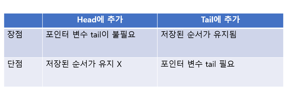 배열 리스트와 비교해보면 SetSortRule함수가 추가된 것을 볼 수 있으며 이는 Head에 추가할지 Tail에 추가할지 정하는 것이다. 장단점은 각각 다음과 같다.