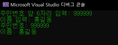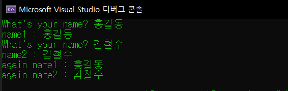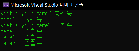 이 경우 ReadUserName 함수 내부에 반환되는 name은 지역변수로 스택 영역에 설정되어 있다. 따라서 함수를 빠져나가면 소멸되므로 실행이 정상적으로 되지 않는다. 그렇다면 이를 전역 변수로 바꾸면 어떻게 될까?